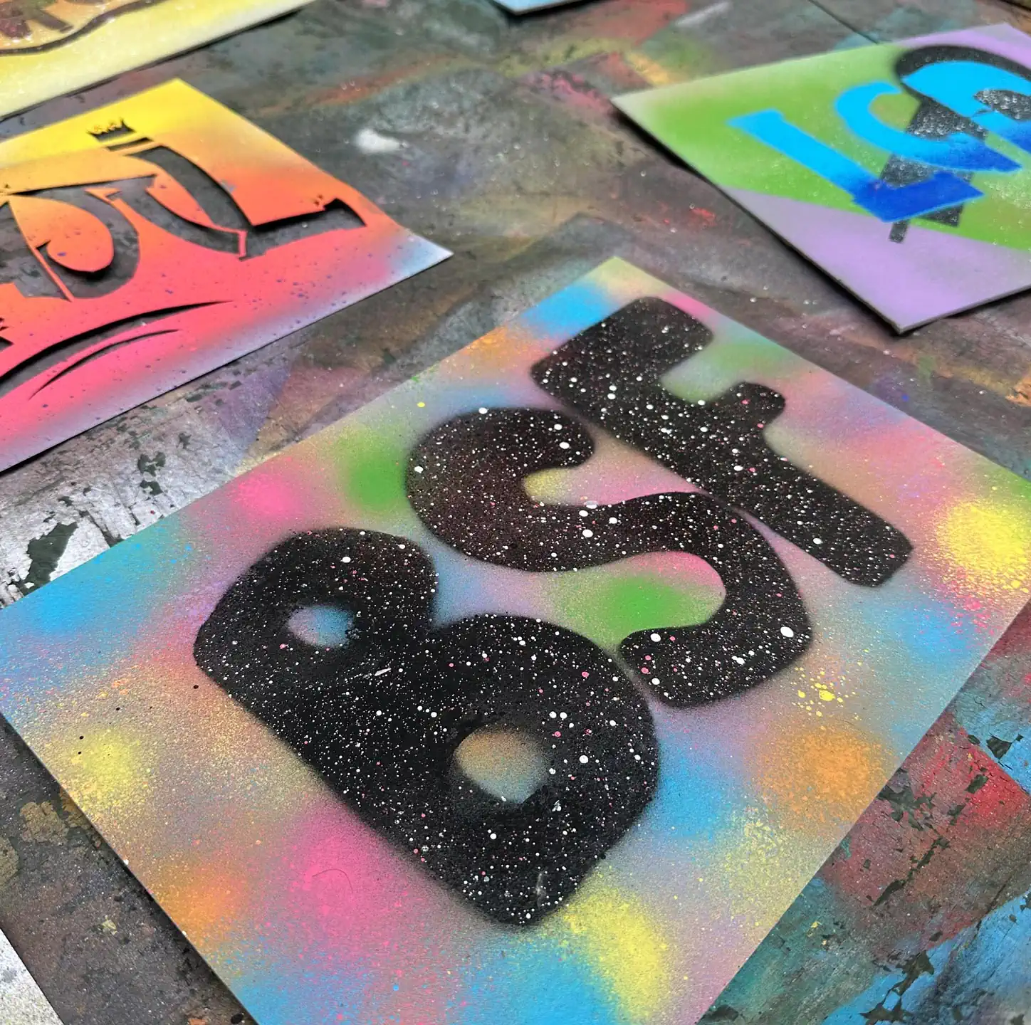 We develop our own graffiti motifs, so-called stencils or stencils. These are then sprayed on grey cardboard, where we get to know the different spraying techniques. Of course, the children take the works of art home with them at the end of the course.