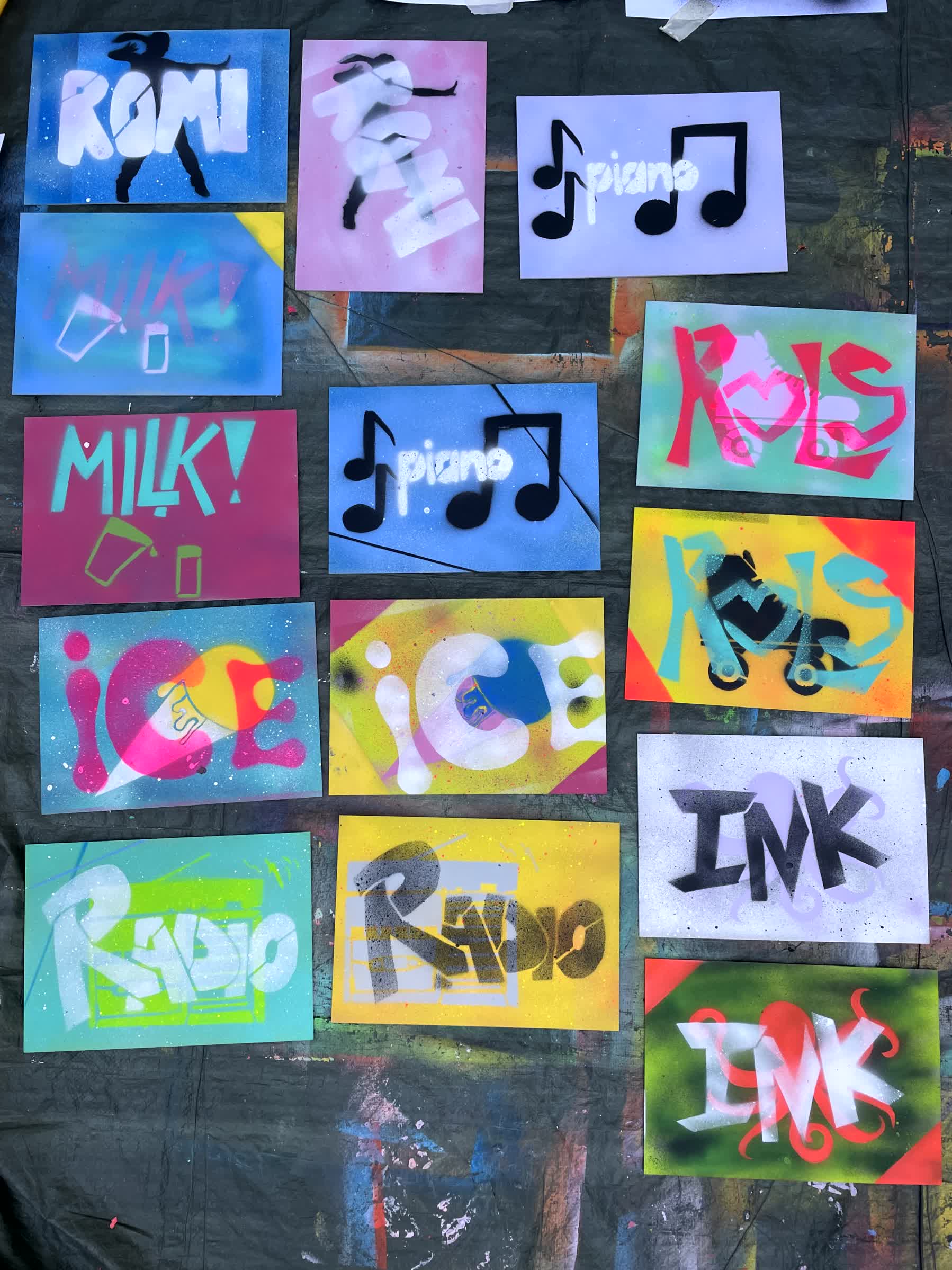 We develop our own graffiti motifs, so-called stencils or stencils. These are then sprayed on grey cardboard, where we get to know the different spraying techniques. Of course, the children take the works of art home with them at the end of the course.